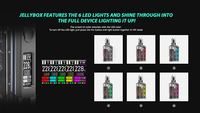 Rincoe Jellybox 228W Kit was made of Zinc alloy and PC, super sleek and solid. It comes with an individuality appearance design and it is simple to operate and all the vaping details. 6 LED lights, which will show you the vape information.